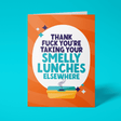 Rude Leaving Card - "Thank fuck you're taking your smelly lunches elsewhere" Funny Farewell Card